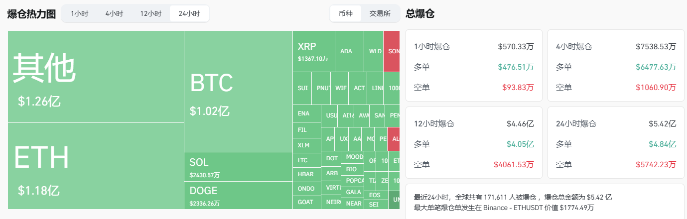 BTC 爆仓金额达 1.02 亿美元,ETH 爆仓 1.18 亿美元,SOL 爆仓 2430.57 万美元。过去 24 小时内全球共有 171,611 人被爆仓,其中最大单笔爆仓出现在 Binance 的 ETH-USDT 交易对上,价值 1774.49 万美元。